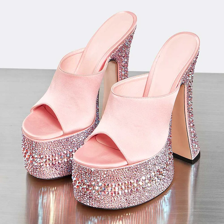Pink Satin Upper Open Toe Crystal Platform Heeled Mules Sandals
