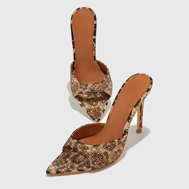Stylish Leopard Print All-Over Rhinestone Open Toe Mule Heels