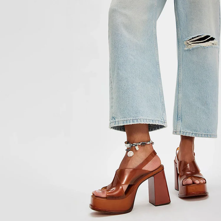 Elevate your style with these chic Brown Clear Open Square Toe Platform Slingback Block Heel Sandals. Perfect for adding a trendy touch to your outfit, combining fashion and comfort effortlessly.