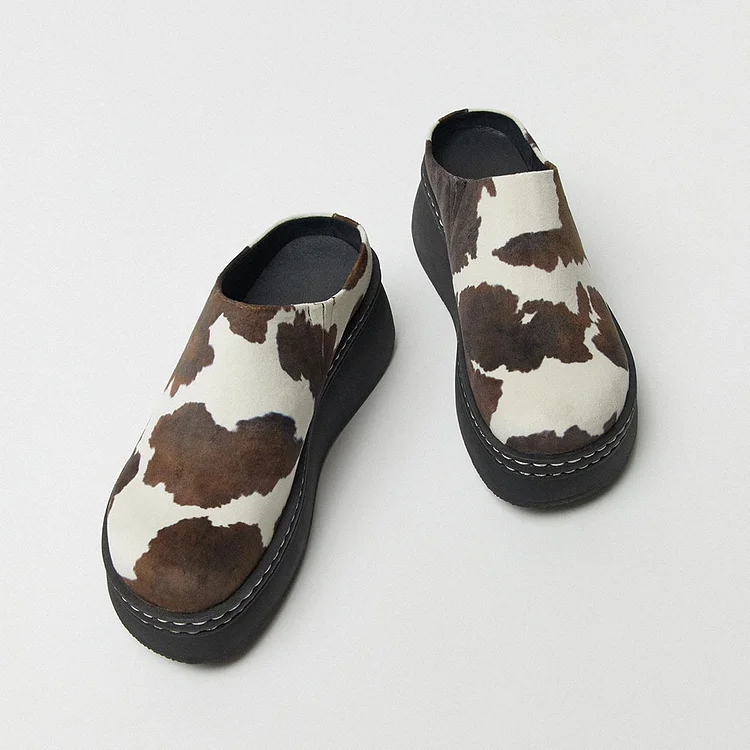 Step into the wild with these unique Brown and White Cow Print Round Toe Wedge Heel Platform Mules. Combining style and comfort, these shoes are a chic statement piece for any outfit.