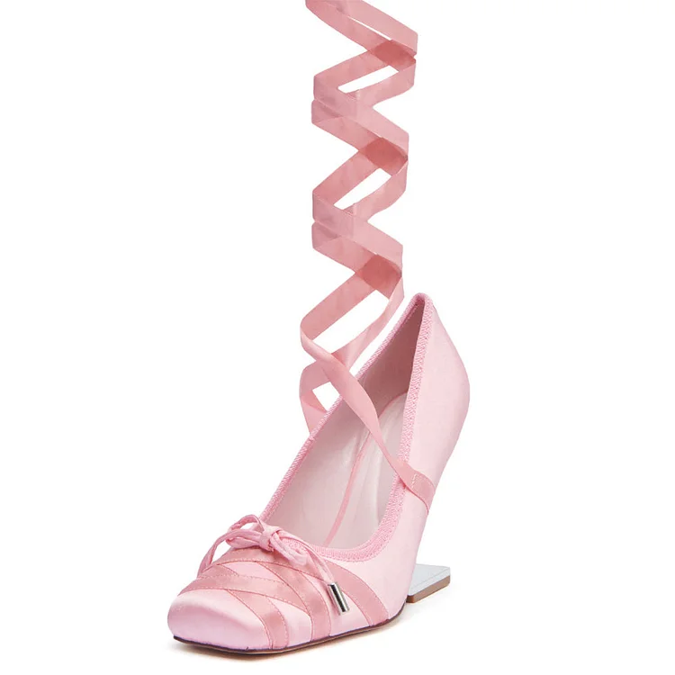 Elevate your style with our Pink Satin Cross Front Ribbon Ballet Heels. Featuring a square toe, bow accent, lace-up design, and satin finish for a charming and elegant look.