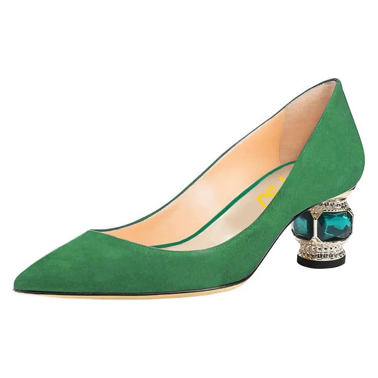 Elevate your style with our Vegan Suede Crystal Decorative Heel Pumps in Green. Chic and cruelty-free, these pumps add glamour to any outfit effortlessly.